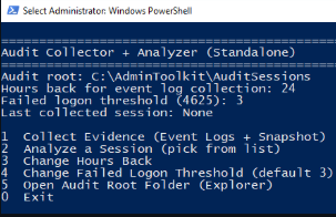 Menu-driven tool that collects Windows logs and system evidence, then analyses sessions to highlight key security and admin events.