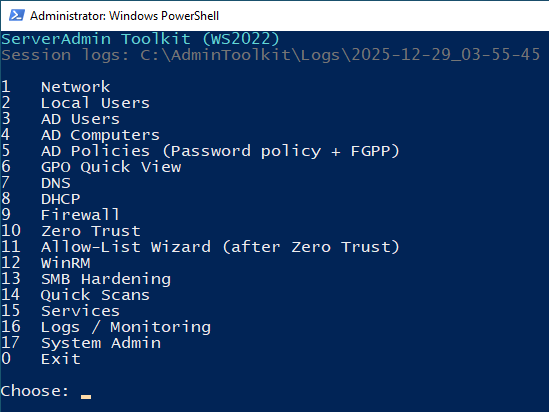 Menu-driven toolkit for common Windows Server admin tasks. Built to practise safe, consistent workflows in lab environments.